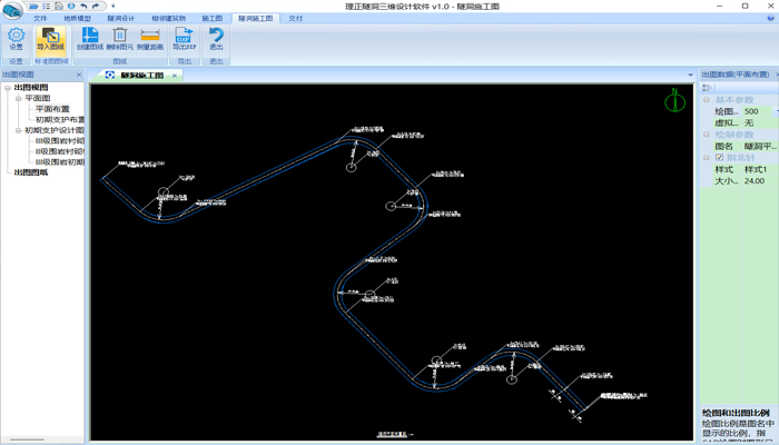 可快速生成隧洞方案平面布置图,支持导入其它DXF图纸如初期支护标准图等进行图纸拼装。用户通过设置图框、图幅、比例等参数完成出图排版,并以DXF格式导出方案图。软件还提供图层、字体、标注等自定义设置,优化出图效果,助力高效交付。