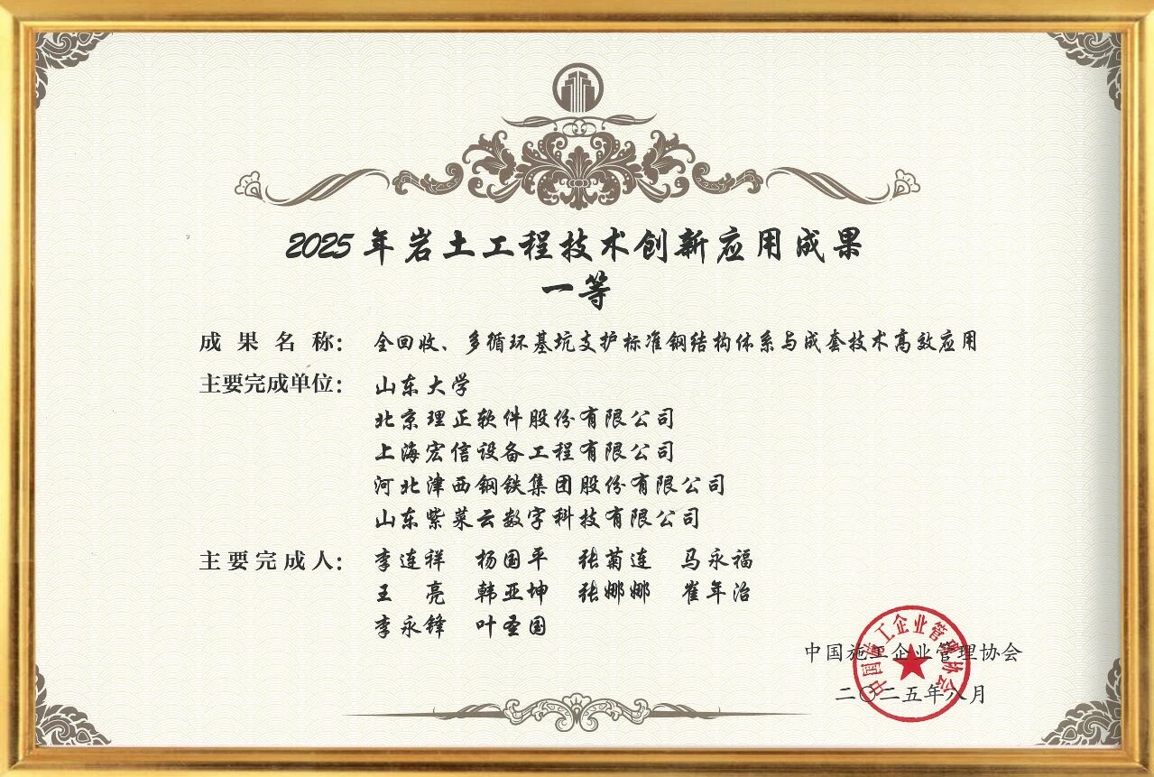 8月20日,第32届岩土工程技术创新交流会在杭州盛大开幕。作为岩土工程领域的年度技术创新盛会,本次大会聚焦行业前沿技术动态,吸引了来自全国各地的300余名专业人士齐聚一堂,共襄盛举,本次大会中,由北京理正软件股份有限公司联合山东大学、上海宏信设备工程有限公司、河北津西钢铁集团股份有限公司、山东紫菜云数字科技有限公司以及相关企业共同完成了《全回收、多循环基坑支护标准钢结构体系与成套技术高效应用》项目,凭借卓越的技术创新性与显著的实践价值,从众多优秀项目中脱颖而出,荣获一等奖。